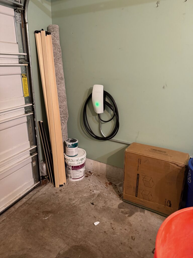 Joel wanted an EV Charger installed in his townhouse in Belleville. The Essex Park community does not allow any additions or alterations to the outside of the townhouse, so we installed the charger inside near the overhead garage door so that he can charge his EV while it’s parked in the driveway. The rubber strip on the bottom of the garage door creates a soft seal around the cord.